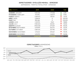 Em 2020 há 10 meses que representam uma quebra, entre março e dezembro, do número de espectadores e da receita bruta de bilheteira, esta última foi de 20,4 milhões de euros, representando um decréscimo de 75,4%, menos 62,7 milhões do que o registado no ano de 2020. Devido à pandemia da COVID-19 os meses de abril e maio registaram uma quebra de 100% com zero espectadores devido ao confinamento obrigatório. O primeiro mês pós-COVID, em junho, apenas 13 mil espectadores foram ao cinema tendo-se registado um aumento gradual no regresso às salas. O melhor mês pós-COVID foi setembro com mais de 363 mil espectadores. 2020 foi o pior ano para as salas de cinema portuguesas nos últimos 10 anos e certamente um dos piores que há memória.