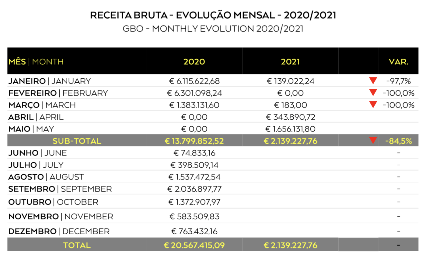 Devido ao encerramento das salas de cinema, logo no início de 2021, foram apenas vendidos pouco mais de 25 mil bilhetes no mês de janeiro e em fevereiro foram zero vendas. Com a reabertura das salas a 18 de abril, o mês da liberdade registou 61.642 espectadores e em maio foram ao cinema 299.601 espectadores, registando 1,6 milhões de euros de bilheteira.