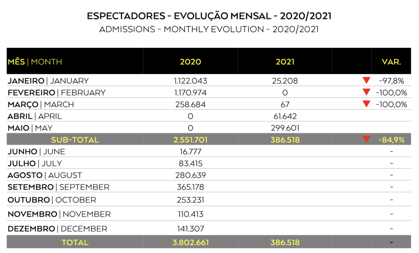 “Em 2020, os recintos de cinema estiveram encerrados entre 18 de março e 1 de junho (75 dias), sendo de realçar que nos dois primeiros meses do ano se registou um crescimento do número de espectadores na ordem dos 12,5%. Ou seja, mais 250 mil espectadores do que no mesmo período de 2019.”