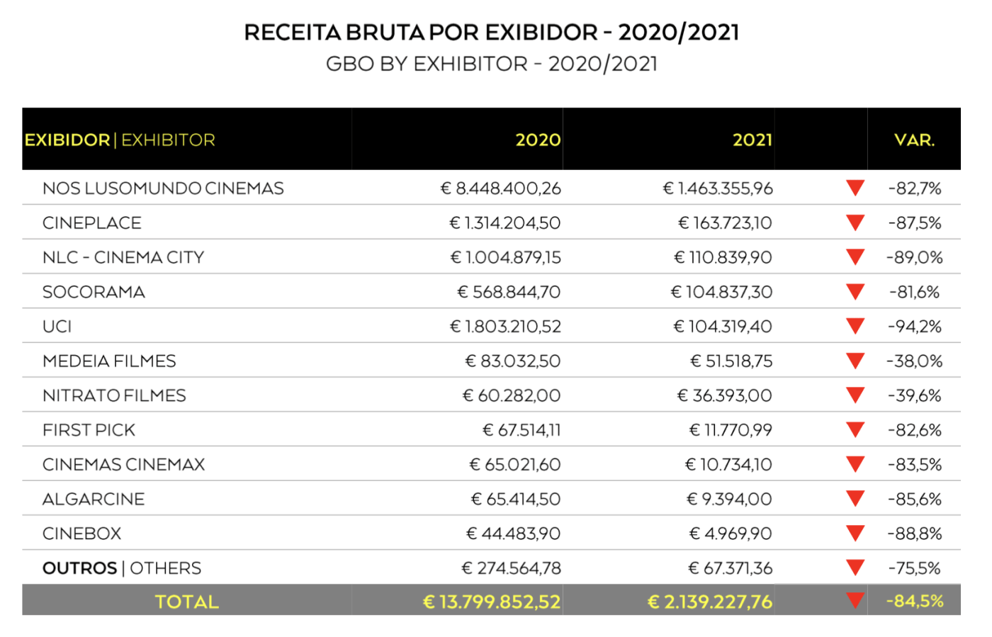 Quanto às exibidoras, de um modo geral acusaram quebras acima dos 80% tanto em receitas como em espectadores, exceto a Medeia Filmes (Cinema Nimas, em Lisboa) e a Nitrato Filmes (Cinema Trindade, no Porto), que registaram perdas no valor de 38% e 39,6%, respectivamente, face ao período homólogo de 2020.