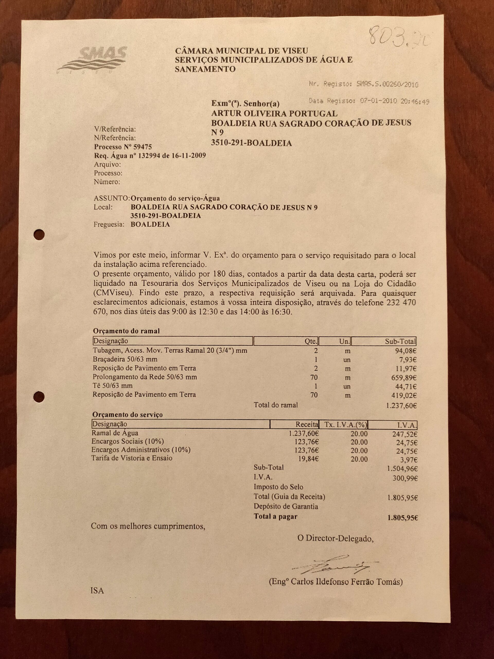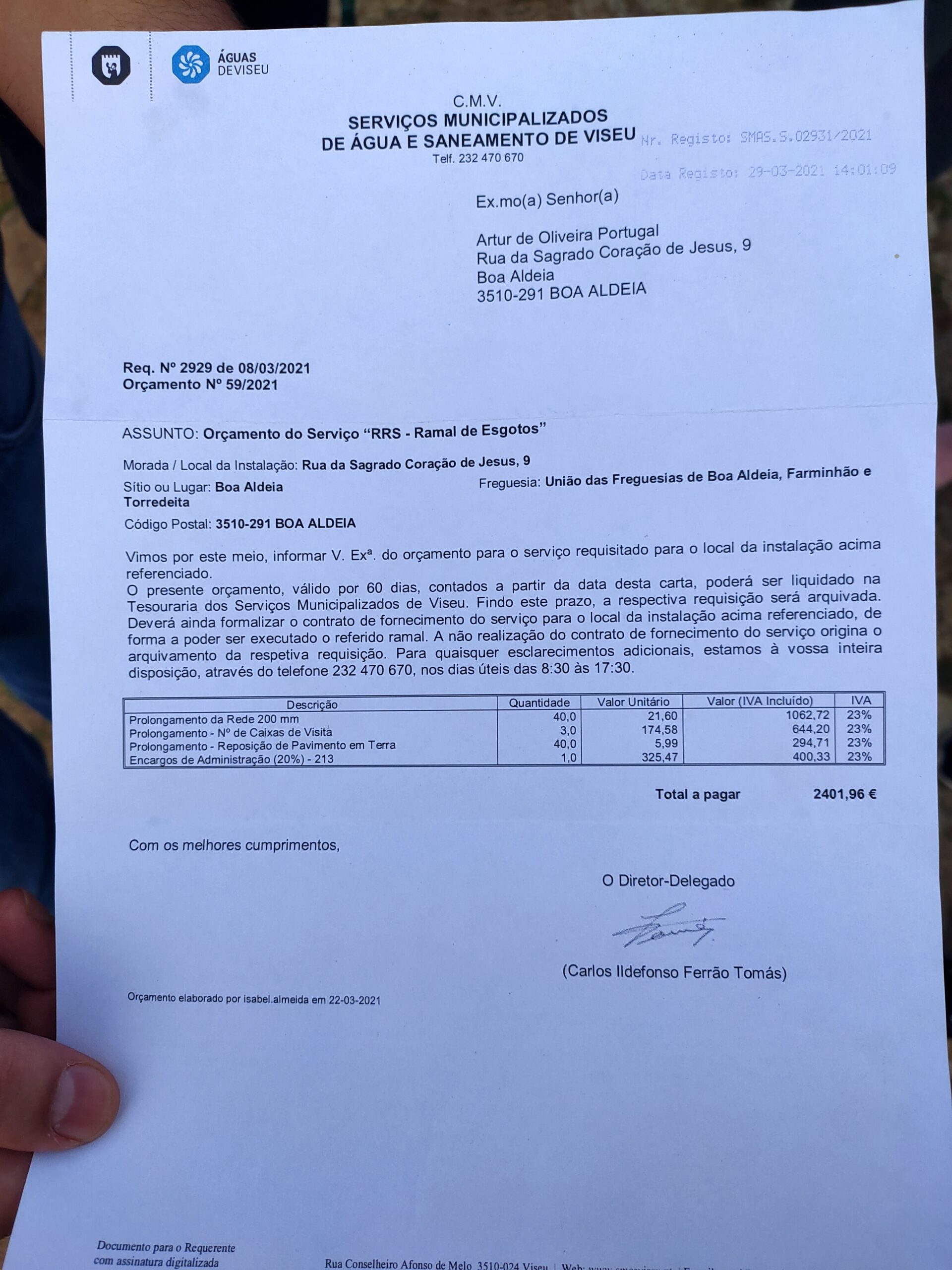 Em 2021 a solução continua a ser a mesma, com a apresentação de um orçamento de €2.401,96 para o saneamento, entretanto pelo que os moradores nos contaram a água passou a ser gratuita.