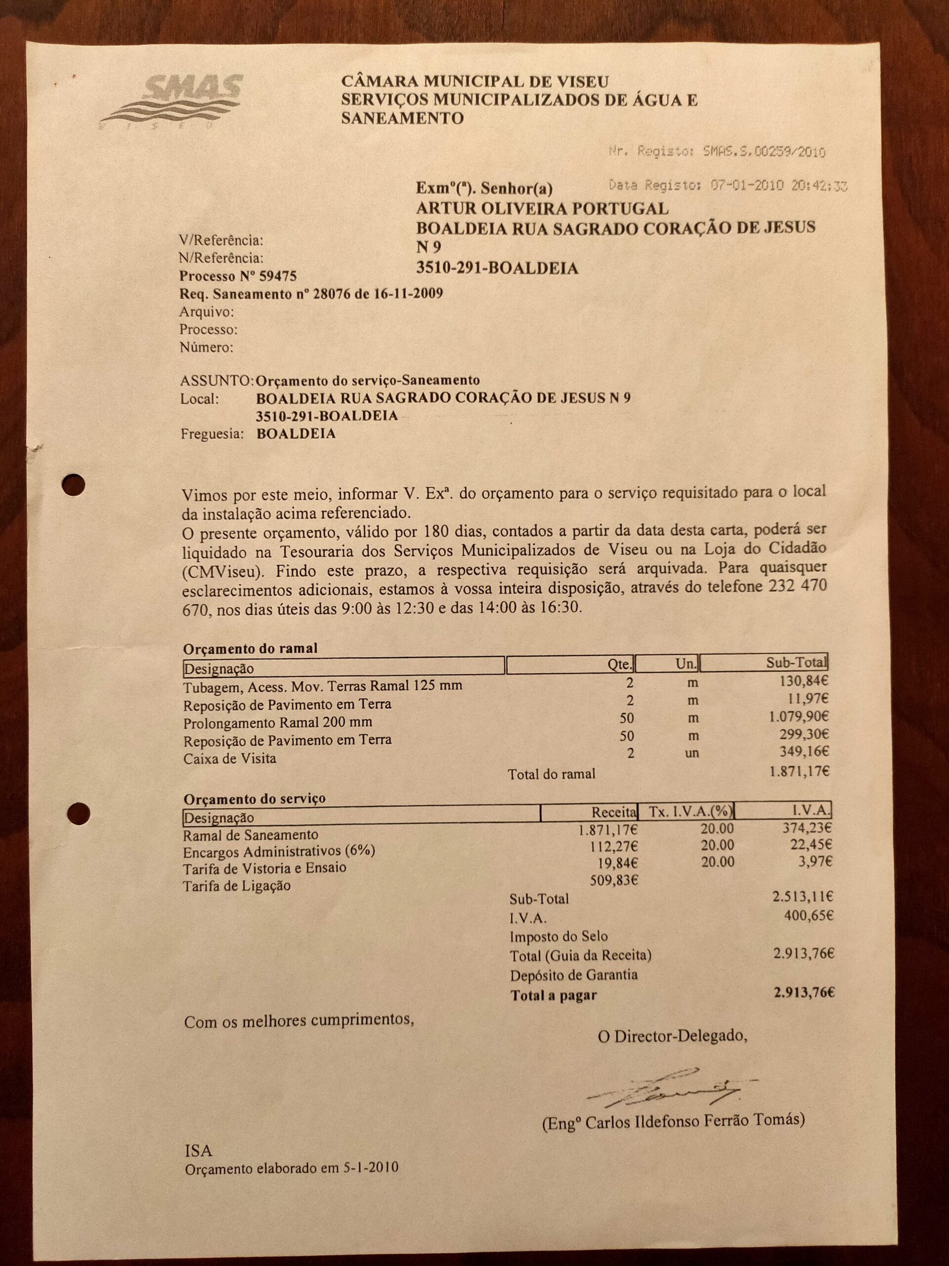 Em causa está o prolongamento do ramal da Rua do Sagrado Coração de Jesus, “70 metros de conduta que poderão vir a servir mais uns quantos fogos na mesma rua”, no caso da água, 50 metros no caso do saneamento, explicam as várias cartas enviadas em 2010 aos Serviços Municipalizados de Água e Saneamento (SMAS), com conhecimento do presidente da extinta Freguesia de Boa Aldeia e do presidente da Câmara Municipal de Viseu, que era então Fernando Ruas.