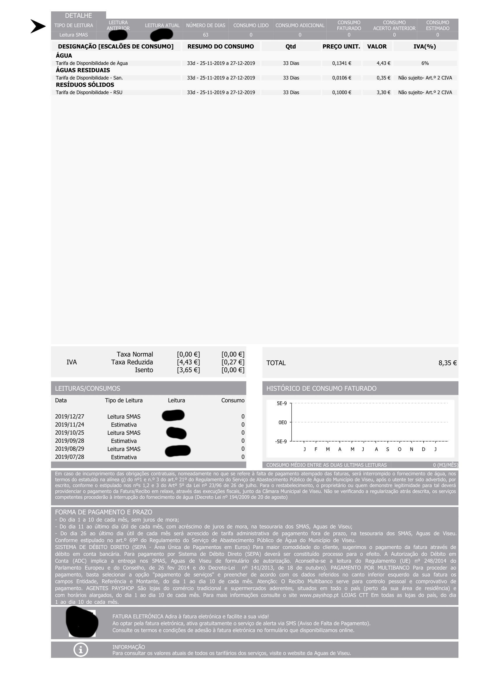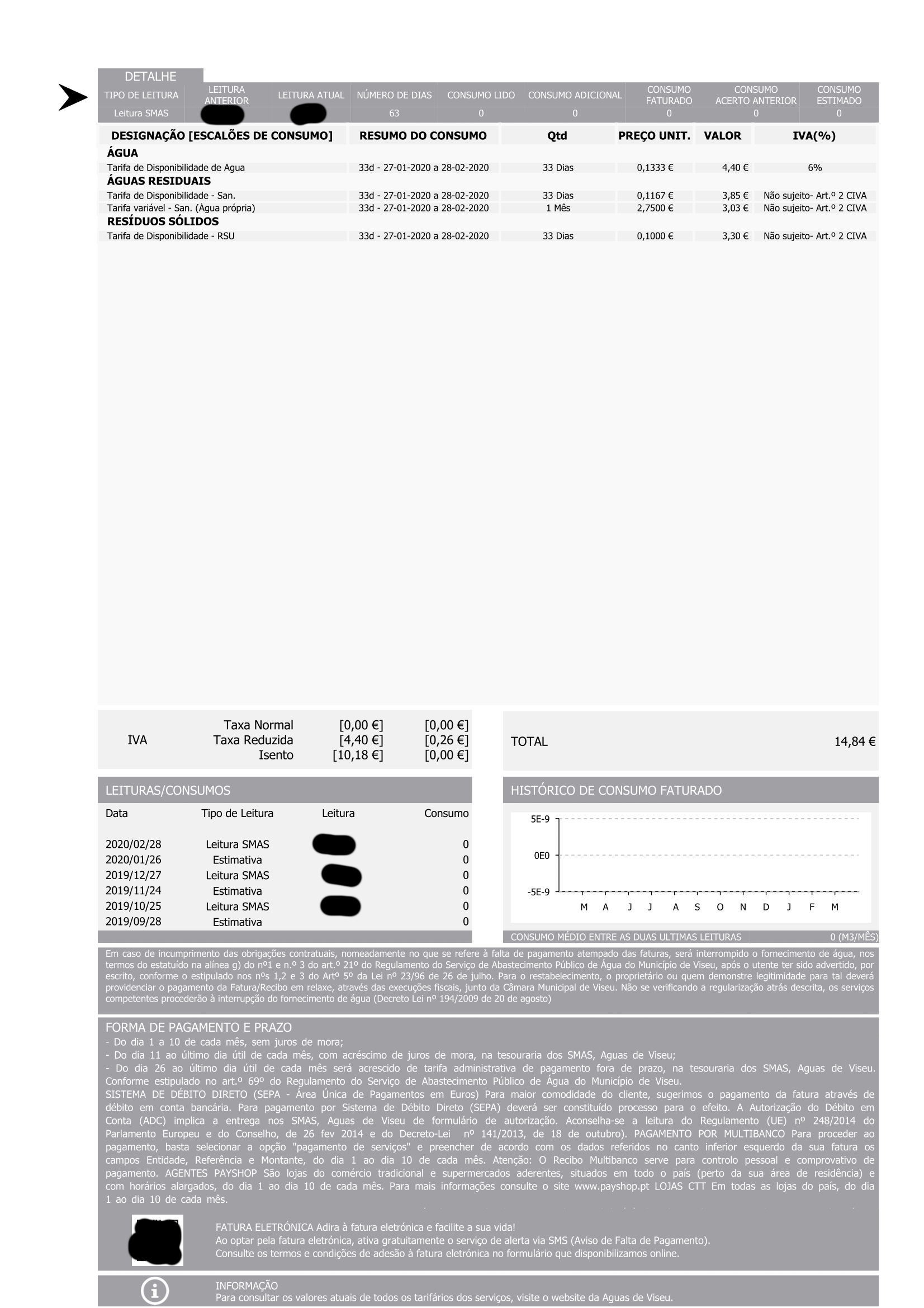Como comprovam as faturas presentes na notícia, ambas de 33 dias e sem qualquer consumo de água, houve um aumento da ‘Tarifa de Disponibilidade – Saneamento’ de 0,0106€ para 0,1167€ por dia, nas faturas comparadas equivale a um aumento de 3,5€. A este, soma-se o acréscimo de uma nova ‘Tarifa Variável de Saneamento’ de 2,75€ mensais que, nos documentos em análise, levou a um aumento de 3,03€. Já na ‘Tarifa de Disponibilidade de Água’ o incremento foi de 0,1333€ para 0,1341€ por dia.