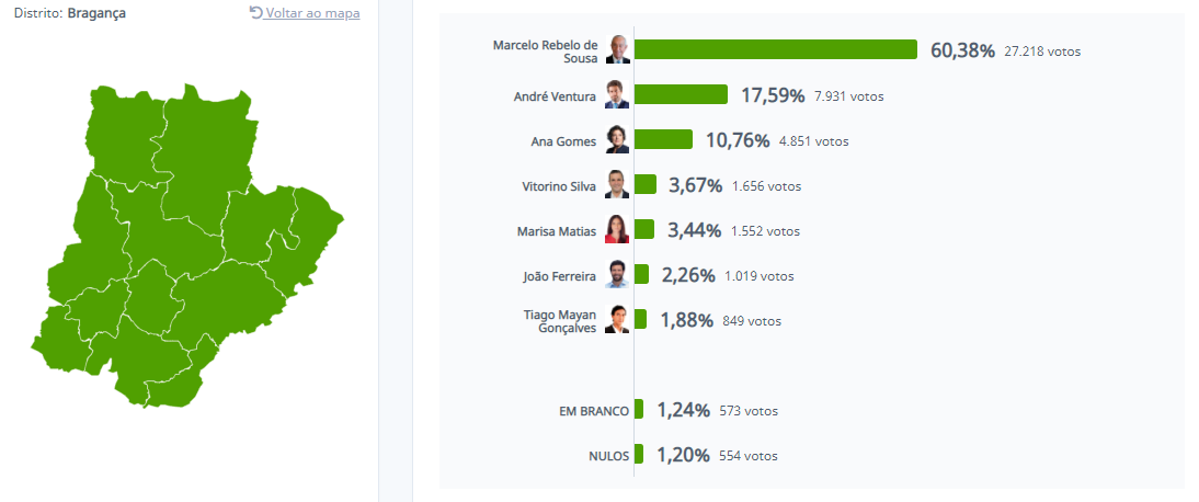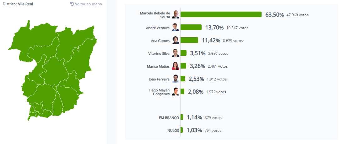 Marcelo reuniu 60,7% dos votos e Ana Gomes ficou em segundo lugar, com 12,97%. Seguem-se André Ventura com 11,9%, João Ferreira, com 4,32%, Marisa Matias, com 3,95%, Tiago Mayan Gonçalves, com 3,22% e Vitorino Silva, com 2,94%. Por Esquerda.net