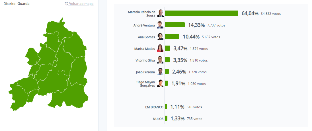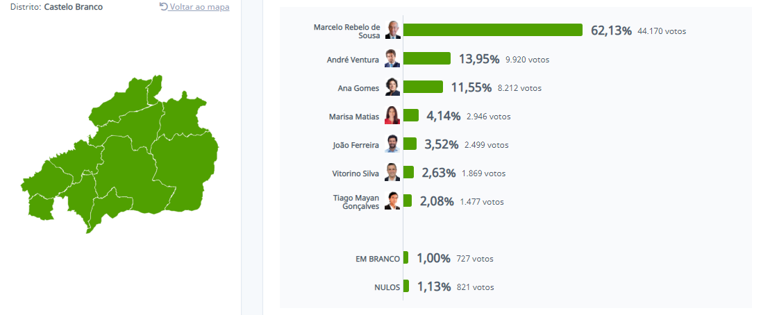 O mapa eleitoral disponibilizado no site da Comissão Nacional de Eleições, que faculta os resultados das eleições presidenciais 2021 distrito a distrito, revela que Marcelo foi candidato mais votado em todo o país.