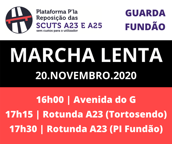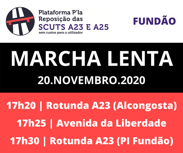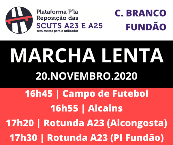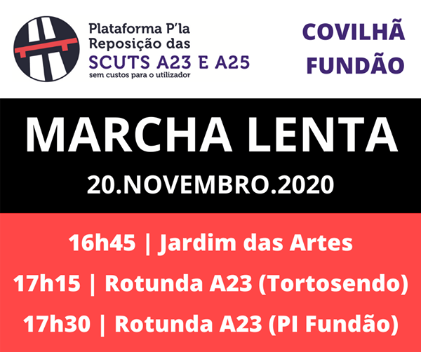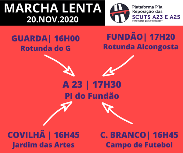 A Plataforma P’la Reposição das SCUTS A23 e A25 está a promover uma marcha lenta no próximo dia 20 de novembro, sexta-feira, a partir de vários pontos em Castelo Branco, Covilhã, Guarda e Fundão.
