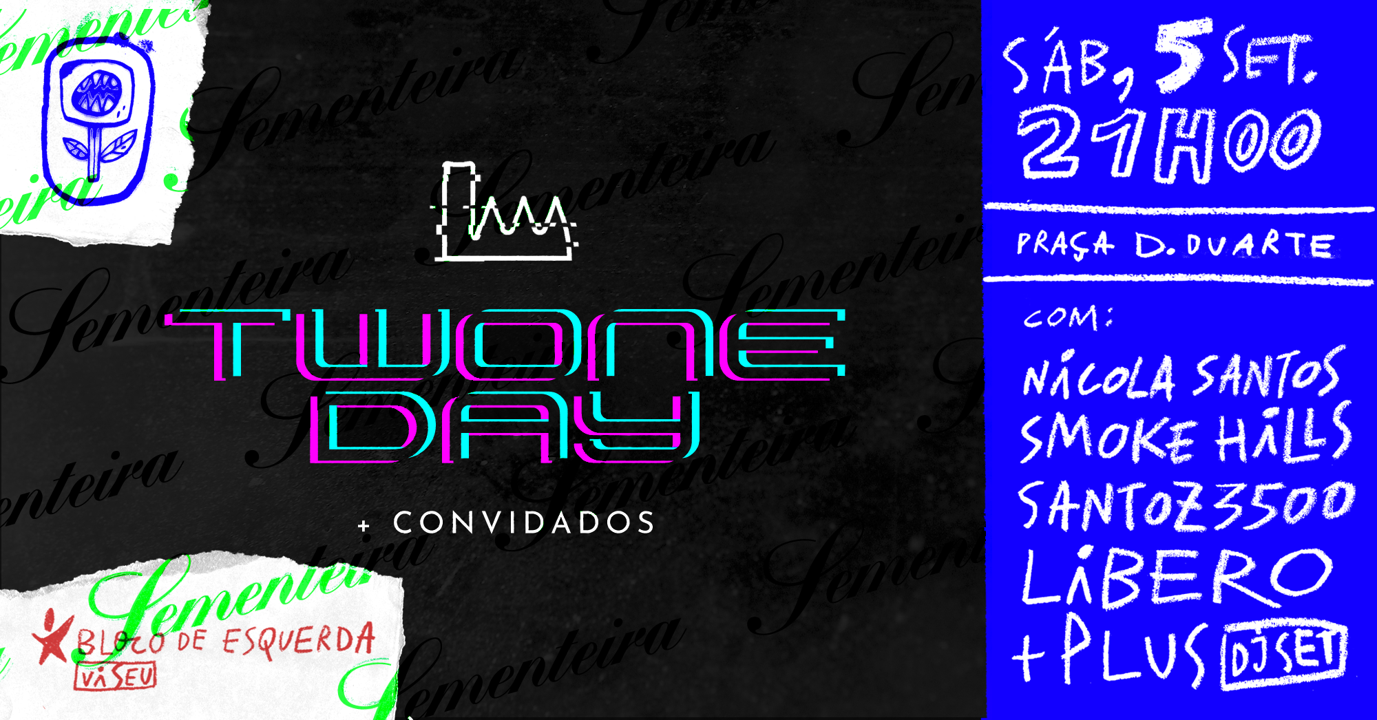 No sábado, dia 5, pelas 21H00, haverá lugar para o momento de RAP TWONE DAY, uma produção da TWONE. “A noite vai contar com o DJ set de +Plus, produtor e DJ de Viseu que pisou inúmeros palcos nacionais, com a estreia do rapper Nicola Santos, com o duo Smoke Hills, que se apresenta ao público pela primeira vez após o lançamento do último projeto (Monte Salvado), com Santoz3500, que volta a “pisar o palco” após a showcase da Fnac e com o regresso de Libero e das suas rimas sociais pela terceira vez à Sementeira.”