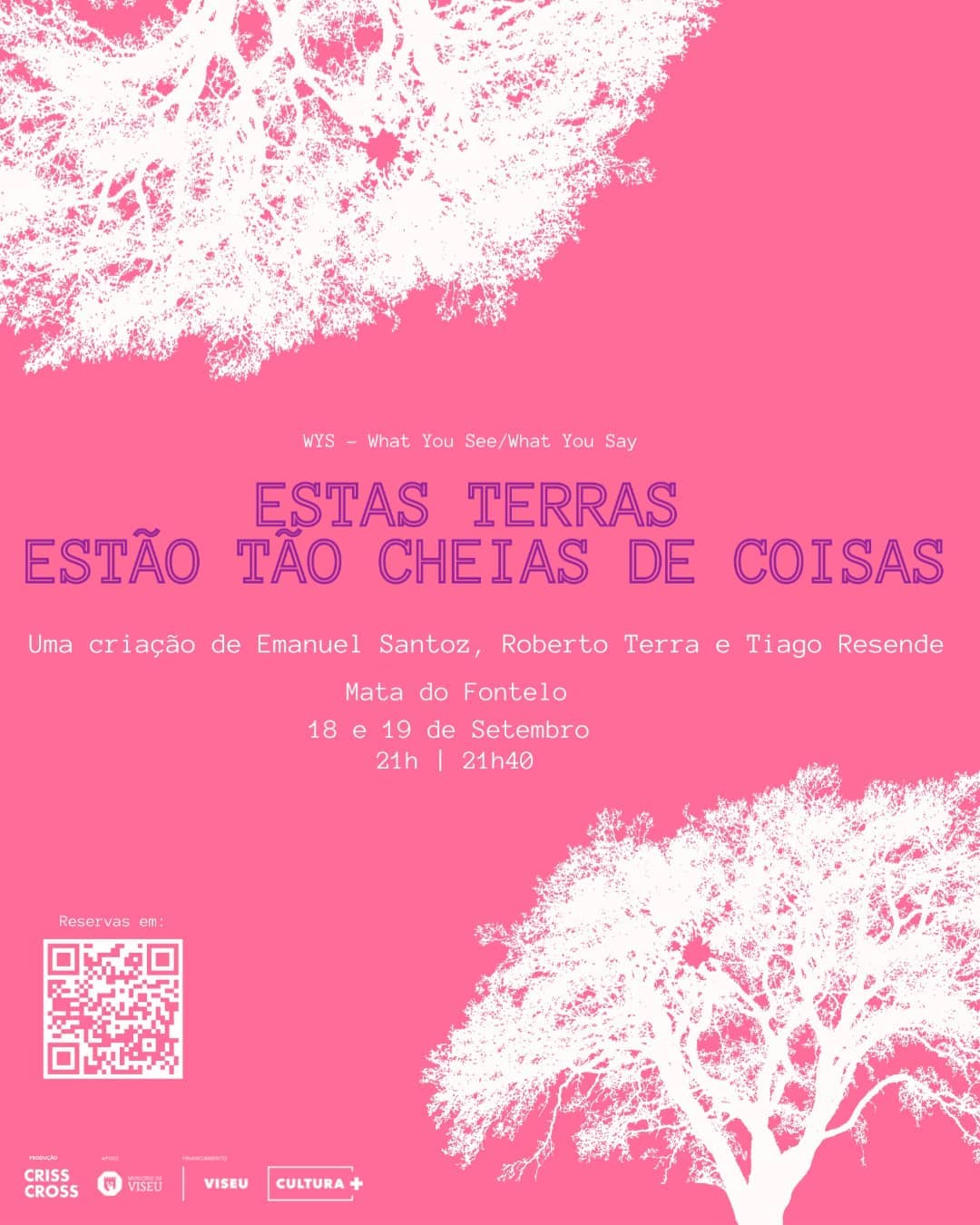 Os atores Emanuel Santoz e Roberto Terra e o cineasta Tiago Resende apresentam a vídeo-performance nos dias 18 e 19 de Setembro na Mata do Fontelo, em Viseu. O mote é revelar um Fontelo que é muitas vezes invisível.