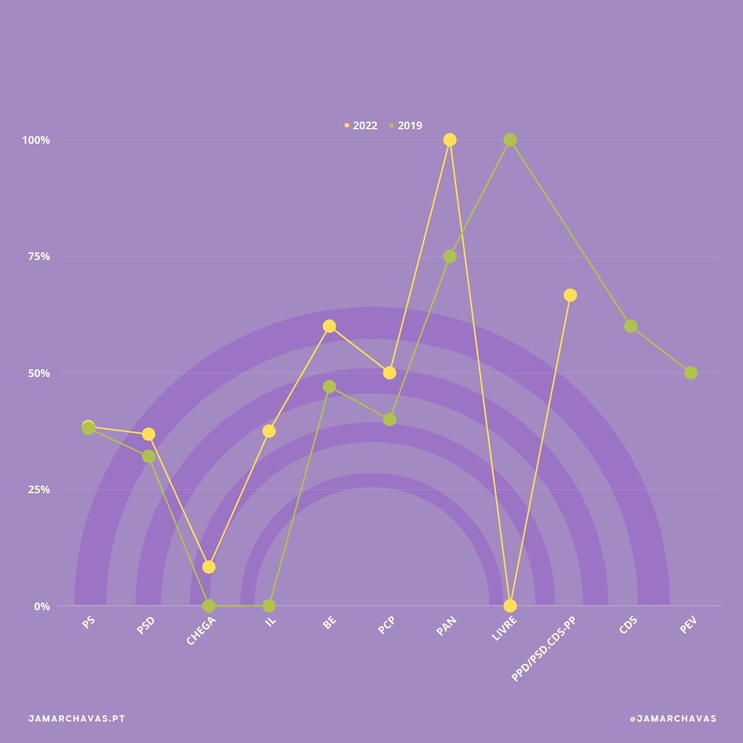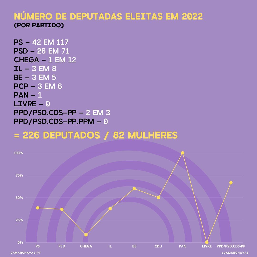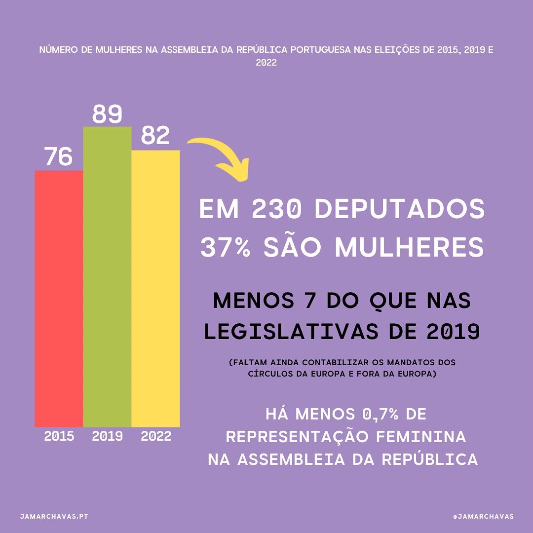 Em 230 deputados, em 2015 setenta e seis eram mulheres, em 2019 oitenta e nove e em 2022 oitenta e duas, menos sete do que nas legislativas de 2019 (faltam ainda contabilizar os mandatos dos círculos da europa e fora da europa).